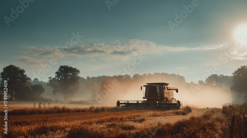 Obraz premium Combine Harvester in Harvested Field with Dust Clouds and Warm Sunlight