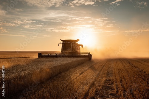Fototapeta premium Combine harvester unloading grain at sunset in a golden wheat field