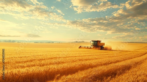 © Tamtam, Naklejka premium Combine harvester working in golden wheat field under blue sky