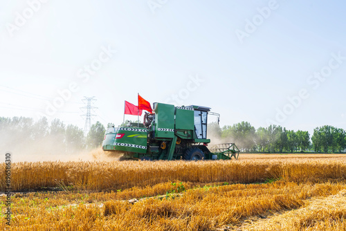 © zhengzaishanchu, Obraz premium combine harvester working on a wheat field