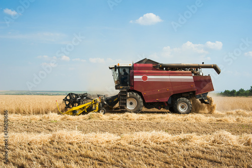 Naklejka premium Combine harvesters in a field of wheat