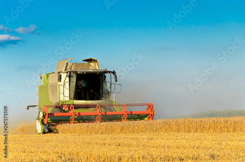 Fototapeta premium Combine harvesting in a field of golden wheat