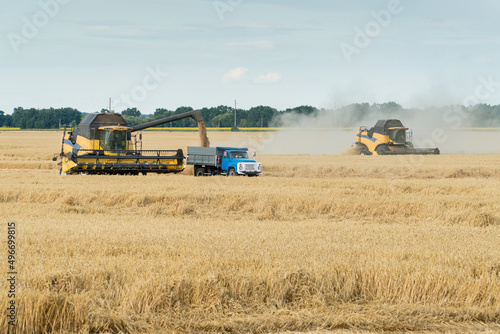 © Volodymyr Herasymov, Obraz premium Combine harvesting wheat field on a falmland.