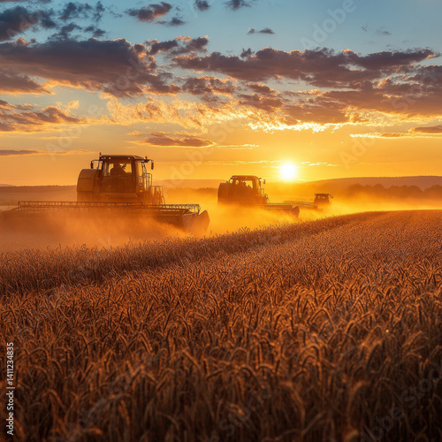 © Birzhan, Fototapeta premium combineers harvesting wheat fields at sunset with golden hues.