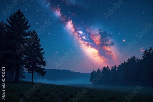 © anu, Fototapeta premium Comet's tail illuminates a tranquil forest landscape under starry skies, serene, trees, nature