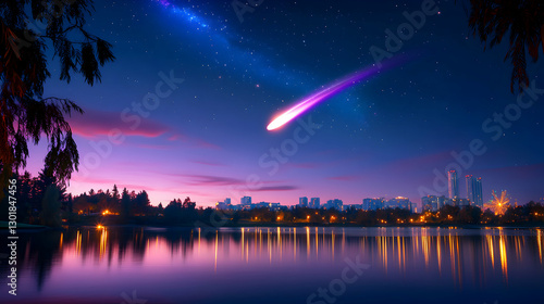 © Maarif, Naklejka premium Comet Soaring Over City Lake at Night