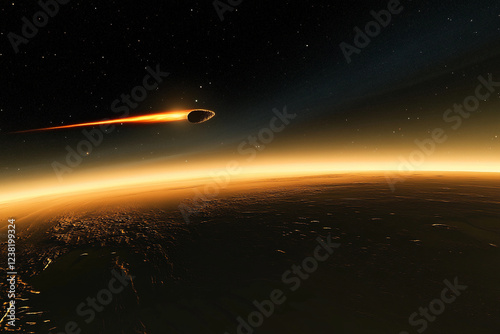 © Oleksandr, Naklejka premium Comet streaks past a rocky surface under a starry sky in a breathtaking cosmic display at night