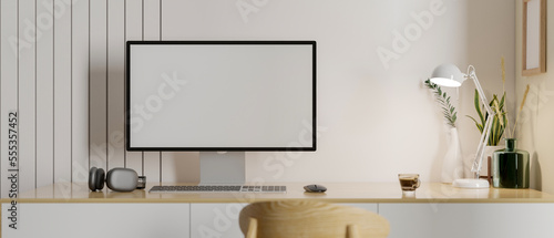 Fototapeta premium Comfortable and minimal working table with computer mockup and decor on wood table