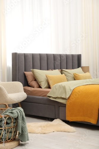 © New Africa, Fototapeta premium Comfortable bed with stylish linens at home. Interior design