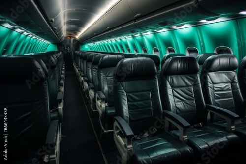 Fototapeta premium Comfortable black leather seats in a modern planes economy class cabin with blue ambient lighting. Suitable for travel, tourism, and aviation industries.