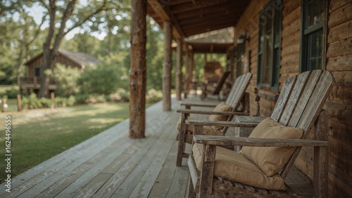 Obraz premium Comfortable deck chairs arranged on the rear terrace of a vacation cabin