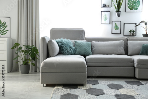 Fototapeta premium Comfortable large sofa in light room. Interior design