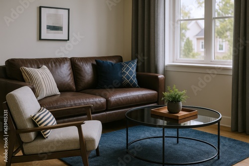 © MDNANNU, Fototapeta premium Comfortable Living Room Scene Featuring a Brown Leather Sofa, Accent Chair, Coffee Table with Plant, and Window View