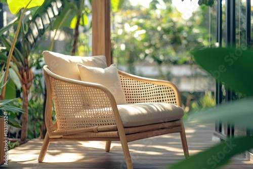 © AHNH2, Obraz premium Comfortable rattan chair with cushions in serene garden setting