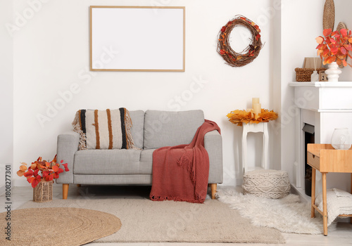 Fototapeta premium Comfortable sofa, fireplace and decor with autumn leaves in interior of living room