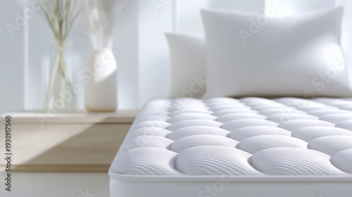 Obraz premium Comfortable white mattress with plush pillows and decorative vase in a bright, airy bedroom setting