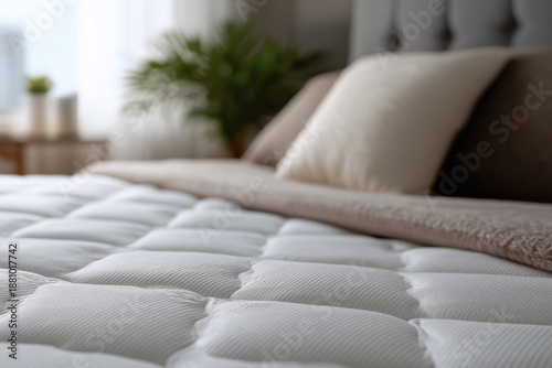 Obraz premium Comfortable white quilted mattress surface with soft pillows and blanket in...