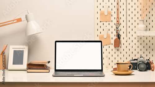 © Prathankarnpap, Obraz premium Comfortable workplace, laptop with blank screen, picture frame , camera and lamp on white table
