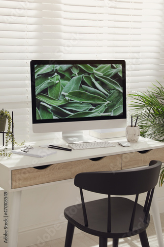 © New Africa, Fototapeta premium Comfortable workplace with modern computer and green plant in room. Interior design