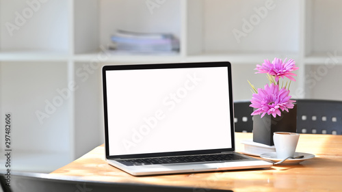 © Prathankarnpap, Obraz premium Comfortable workspace with laptop, coffee and flower.