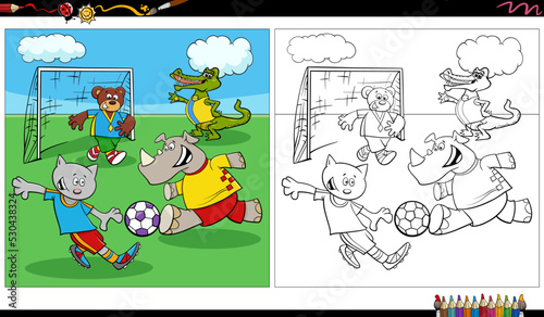 Fototapeta premium comic animals group playing soccer coloring page