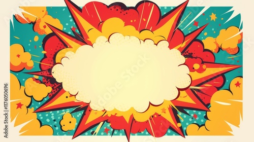 Fototapeta premium comic book-style speech bubble with red and blue dots, explosion pattern, and dynamic yellow and green colors.