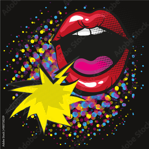 © Ka Lina, Obraz premium Comic lips shout Speech Bubble Pop Art On Dot black Background Vector Illustration