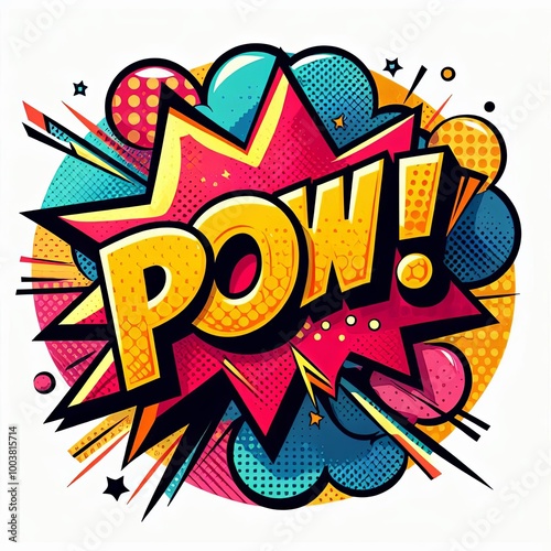 © Irene Kulinchyk, Fototapeta premium Comic speech bubble POW with colorful explosion and dynamic effects, isolated on white background. Pop art illustration for poster, banner, or graphic design