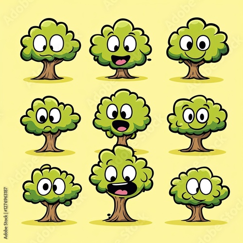 © Khaula_Annasya, Obraz premium Comic tree characters with expressions, lined on a yellow background for educative use