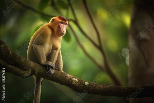 Fototapeta premium Comical Proboscis Monkey Lounging in the Borneo Mangroves, created with Generative AI technology