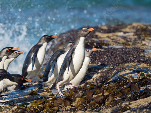 Fototapeta premium Coming ashore at a rocky coastline on Saunders Island. Rockhopper Penguin,...
