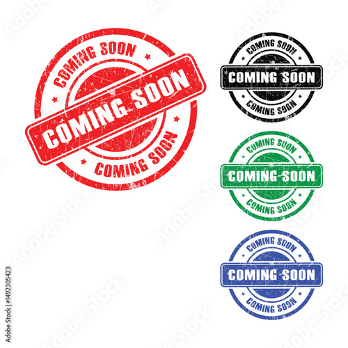 Obraz premium Coming Soon Grunge Stamp Set – Red, Black, Green, and Blue Circular Vector...