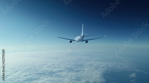 © Oppilamani, Fototapeta premium Commercial Airplane Cruising at High Altitude Against a Clear Blue Sky with Distant Clouds Creating a Serene Aerial View