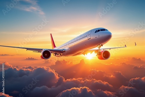 Obraz premium Commercial airplane flying above clouds at sunset with golden sky.