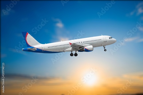 © BillionPhotos.com, Obraz premium Commercial airplane flying in blue sky, preparing for landing.