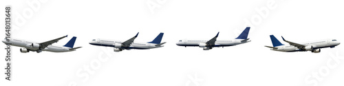 © Totomonk, Fototapeta premium Commercial airplane flying in different angles with white fuselage and blue tail, showing various views of aircraft in flight
