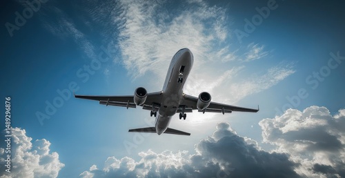 Fototapeta premium Commercial airplane flying low over clouds with bright blue sky and sunlight...