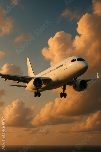 © dodi, Obraz premium Commercial airplane flying through sunset sky with dramatic clouds