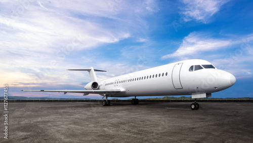 Obraz premium Commercial airplane on the runway with a blue sky background