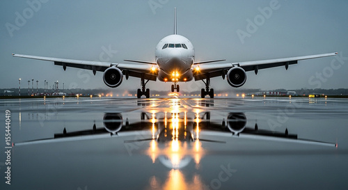 © Asad, Obraz premium Commercial airplane prepares for takeoff on a wet runway with striking reflections