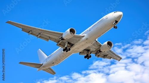 © Thanawat_Suesoypan, Fototapeta premium Commercial airplane soaring through a clear blue sky