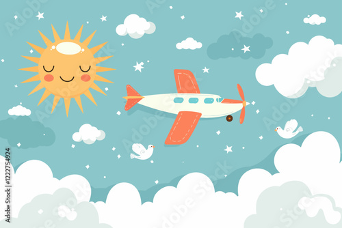 © bit, Naklejka premium Commercial airplane soaring through a clear blue sky, leaving a trail of fluffy white clouds behind, sunlit wing reflections