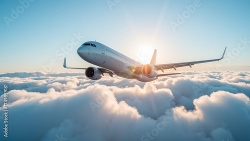 Obraz premium Commercial airplane soars above fluffy clouds during sunset, creating serene...