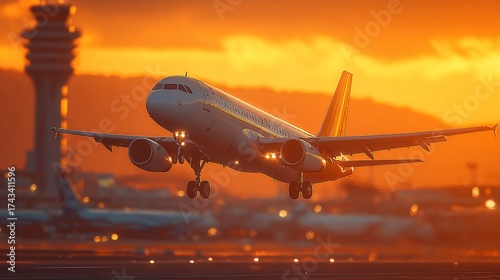 © mamat, Fototapeta premium Commercial airplane taking off against stunning golden sunset sky and control tower in background