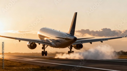 © yanli, Obraz premium Commercial airplane taking off during sunset with visible tire smoke on runway