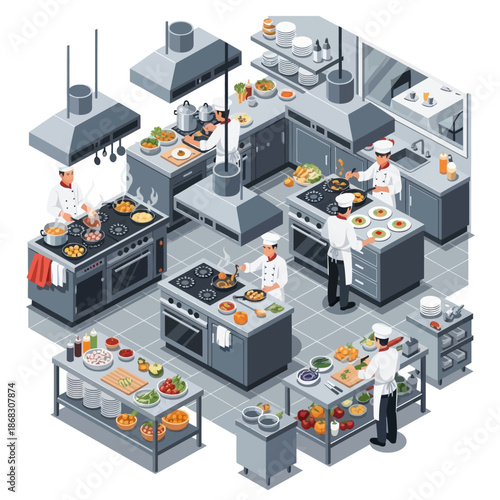 © Dion, Obraz premium Commercial Kitchen with Chefs Preparing Food.