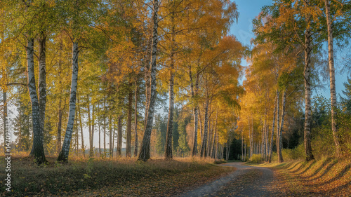Obraz premium "Commercial landscape, golden autumn forest with soft morning light, rich...