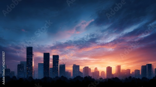 © Thares2020, Fototapeta premium Commercial office buildings skyline at sunrise