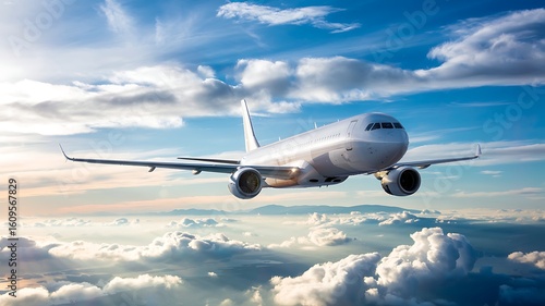 © Design Stock, Fototapeta premium Commercial passenger airplane flying through a bright blue sky filled with fluffy white clouds during a beautiful sunny day