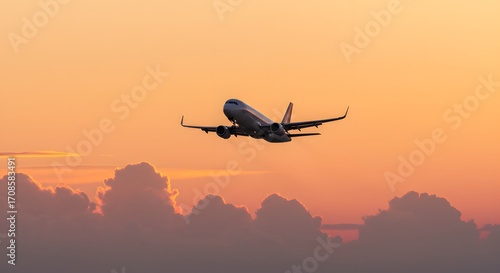 © Bandri.Art, Fototapeta premium Commercial passenger airplane taking off and ascending into the colorful sky during a breathtaking sunset, a symbol of modern air travel and vacation